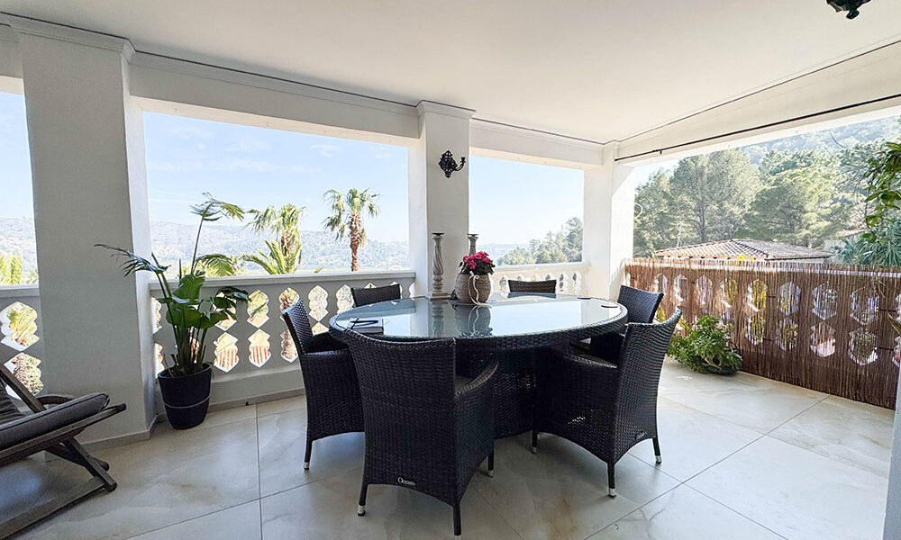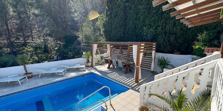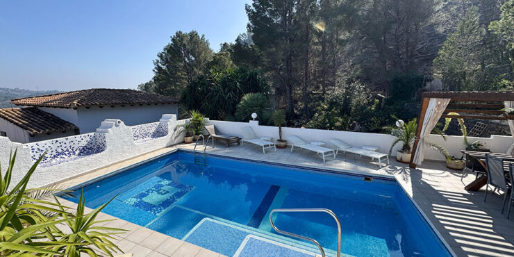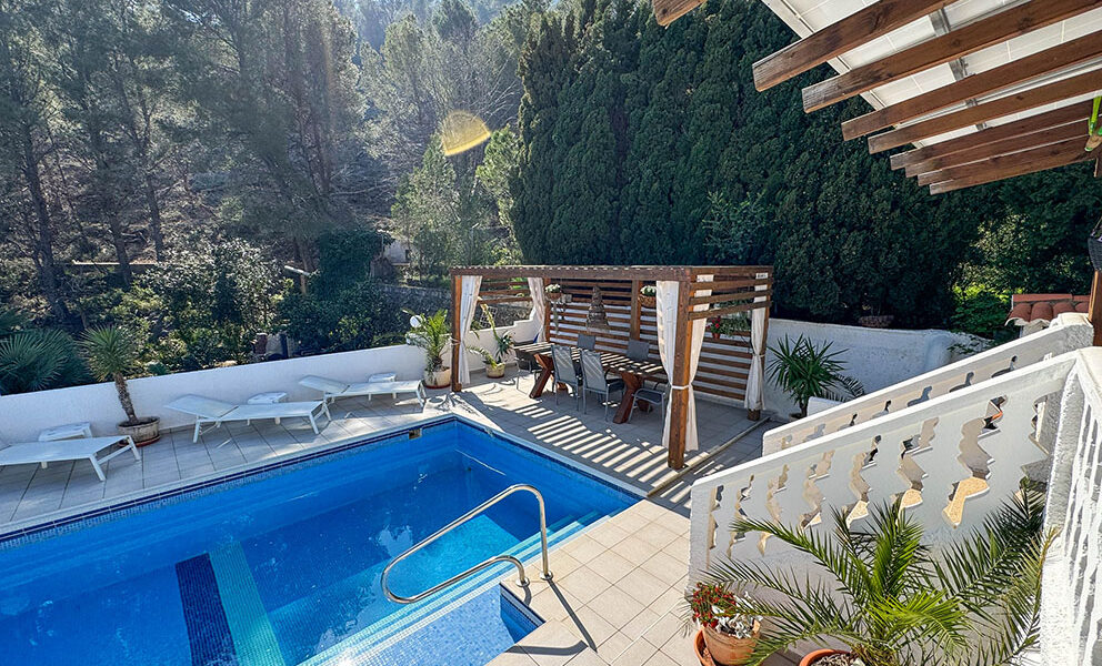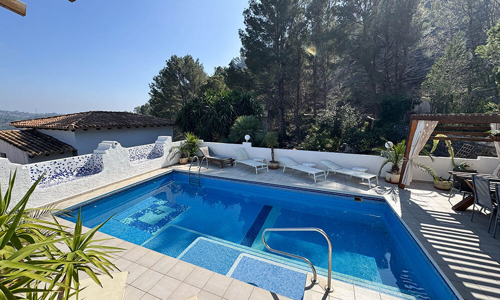 There is a well-appointed, open-plan, modern, and high-quality, fully fitted kitchen, complete with integrated electro-domestic units. The kitchen opens to the dining space, where you also have patio doors flowing out to the covered terrace, and the dining area also continues to the lounge, where you have a log-burning stove. There are two bathrooms, a store room and a central hallway that takes you to the rear of the property, where this opens to another spacious covered terrace overlooking the swimming pool. This covered terrace has a trendy bar area and a relaxed seating area, with a staircase taking you down to a gazebo terrace for poolside dining and a wonderful 8m x 5m newly tiled swimming pool with a terrace surround for sunbathing.
