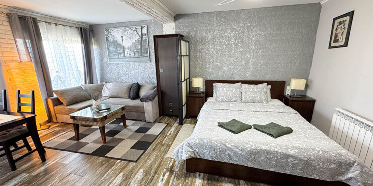 The fourth apartment is where the current owners use and this has a large lounge/dining room complete with a small log burner, hot/cold air conditioning, and two sets of patio doors opening to a lovely courtyard terrace where you can sit and relax. There is a double bedroom, bathroom/wet room and you also have a good-sized fully fitted kitchen. This apartment also has gas central heating radiators.