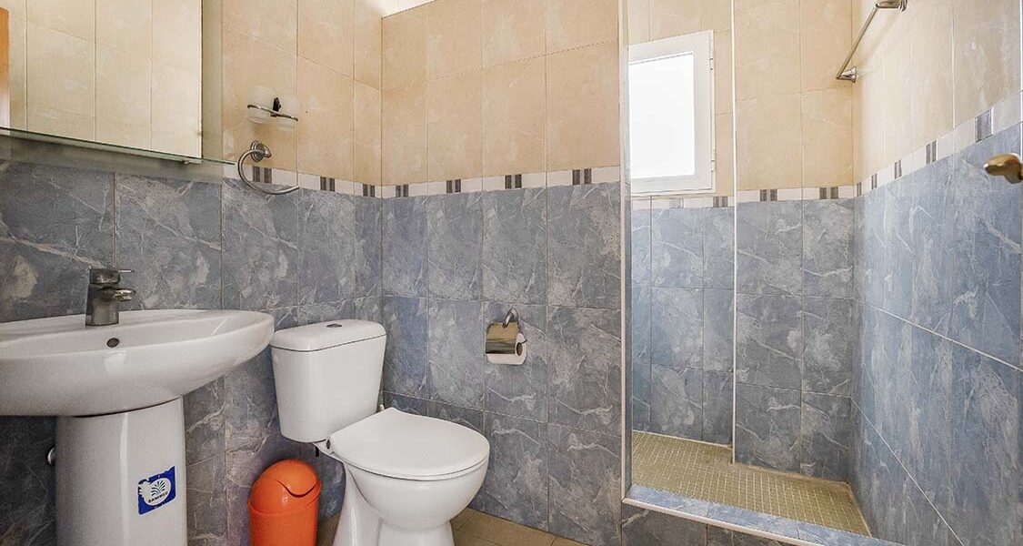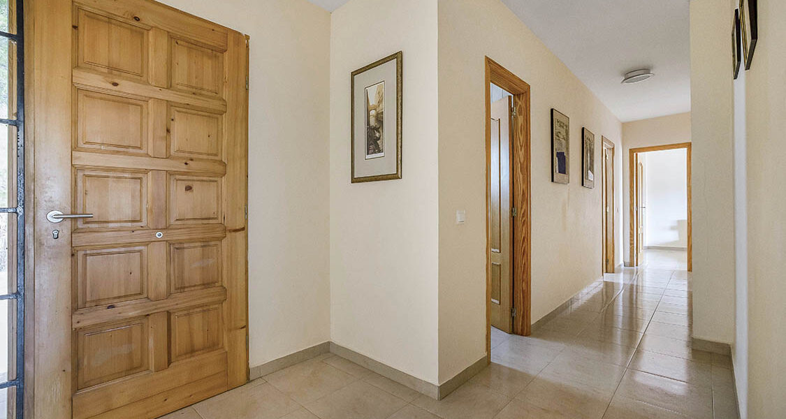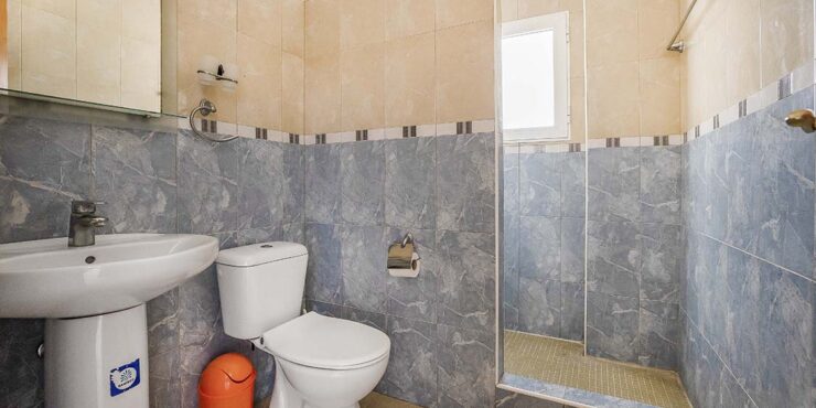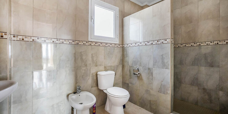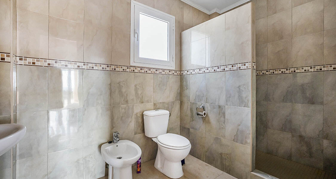 Back inside the villa, after passing through the front door, you have a reception hallway that leads to all the rooms. The lounge/dining room is spacious, and you have both a ceiling fan and electric radiators in here. Double-glazed windows have been fitted throughout the entire property. The kitchen on this floor is complete with modern electro-domestic appliances, including a dishwasher. There is a family bathroom complete with a bath. There are three double bedrooms on the main floor with fitted wardrobes. The master bedroom also has a lovely en-suite bathroom, with a large walk-in shower and, as discussed, the bedroom has patio doors out onto the terrace.