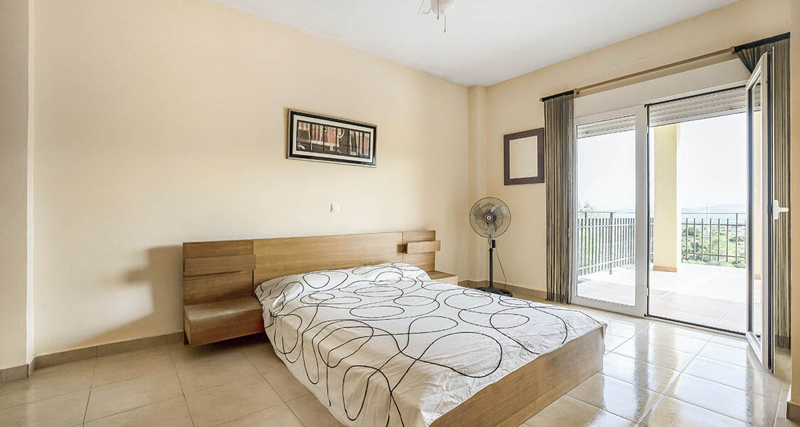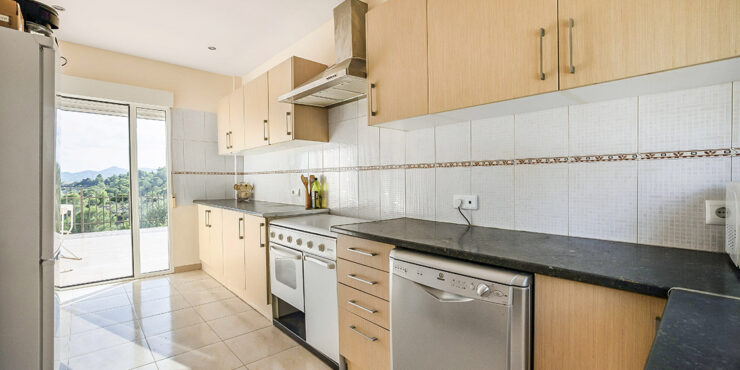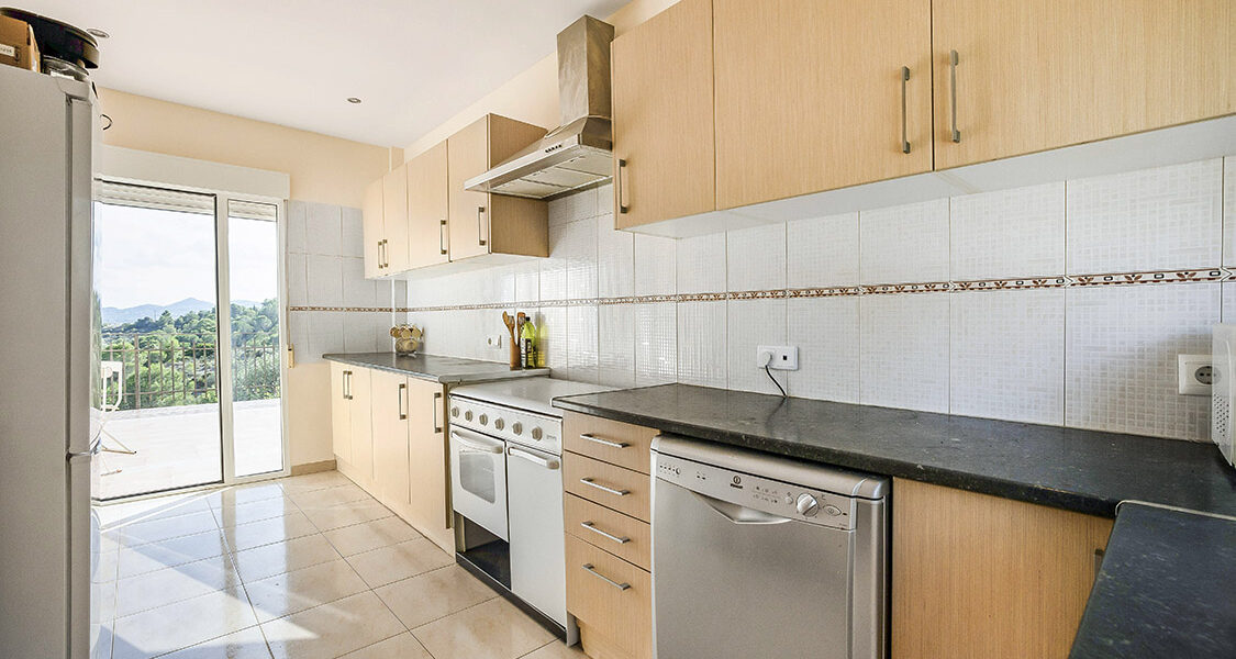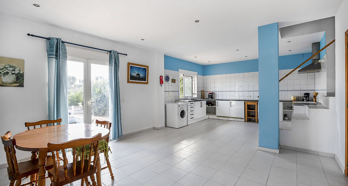 This is a fully fenced property with double gates at the front opening to a wide driveway where you have space to securely park multiple cars. The villa is split over two levels as this is a large property. There is a staircase taking you up to the first floor, where your main accommodation is situated. Here you have a spacious lounge/dining room complete with double sets of patio doors that open onto the large balcony terrace, which sweeps around the entire rear and side section of the villa. This large terrace space has both covered and open areas and can also be accessed from the kitchen and the master bedroom, each with their own patio doors. It is a lovely space to enjoy a meal, taking in the spectacular views.