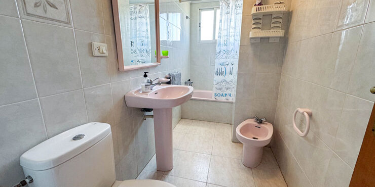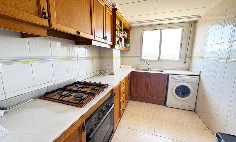 There is also a utility room located at the end of the terrace, where you have your electric hot water boiler and outside sink where you can wash off your sandy shoes. Inside this utility room, you actually have space to relocate your washing machine, if you were to later decide to install a dishwasher in the apartment’s kitchen space. Then on the roof terrace you have a large open area where you have a designated area for clothes drying line which is very handy and from this terrace you have panoramic views of the sea and mountains in the distance. This top floor apartment is being sold fully furnished and complete with electric fans for all the rooms.