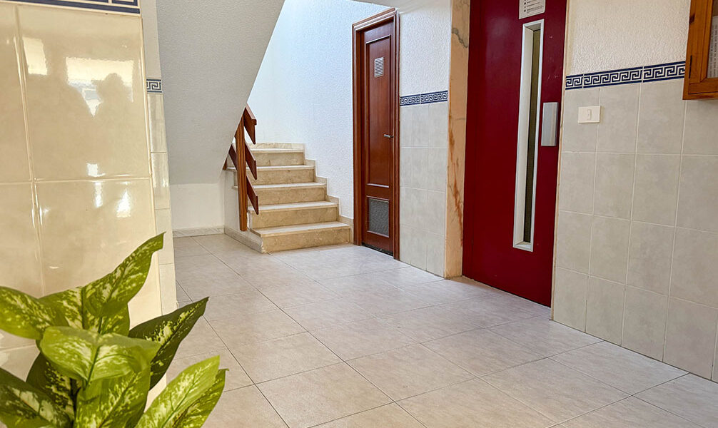 This two-bedroom penthouse apartment is situated just 100m from the beachfront. It has a privileged position at the end of the building, benefiting from much natural light inside gained from having windows facing out to three sides of this building. The apartment block itself is well presented externally, and it is clean and well-maintained inside its communal areas. There is a door telecom entry system with an elevator taking you up to this fifth-floor apartment.