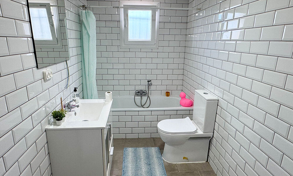 Inside the villa, you have a spacious kitchen that leads out to the covered terrace. The kitchen is a good size and it is fully fitted with white units and it also has an island, which is a nice feature. The lounge/dining room has a chimney fireplace and hot/cold air conditioning, and this is accessed from the central hallway between the kitchen and the lounge. Then also on this ground floor, you have two double bedrooms each with fitted wardrobes, and a bathroom/wet room complete with a walk-in shower.